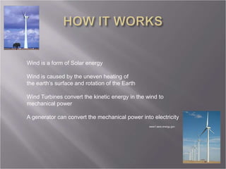 Wind turbines convert the kinetic energy of wind into mechanical power using rotating blades. The mechanical power spins a shaft connected to a generator which produces electricity. Key components include blades, a gearbox, generator, and tower. Developments aim to increase wind power generation through larger offshore wind farms and high-altitude wind technologies like airborne wind turbines and kite generators that access stronger winds in the jet stream.