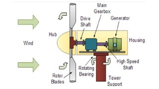 This document discusses wind energy and types of wind turbine systems. It begins by explaining the basics of wind energy, including that winds are caused by differences in air pressure between high and low pressure areas. Wind turbines convert the kinetic energy of wind into mechanical then electrical energy. The document then discusses the local and planetary origins of winds on Earth and factors that determine wind speed and power. It provides installation data for wind power in India and classifications of horizontal and vertical axis wind turbines along with examples like Savonius and Darrieus turbines. Advantages of wind power include being renewable and not producing emissions, while disadvantages include noise, impacts to wildlife, and high initial costs.