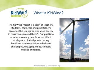 The document discusses wind energy technology and what designs work best. It summarizes that horizontal axis wind turbines are generally more successful than vertical axis designs. Key factors that determine turbine performance are discussed, such as airfoil shape, tip speed ratio, rotor solidity, and controls like variable pitch and stall regulation. Common materials used for blades like wood, metal, and fiberglass composites are also outlined. The goal of the KidWind project is to introduce wind power concepts to students through hands-on science activities.
