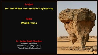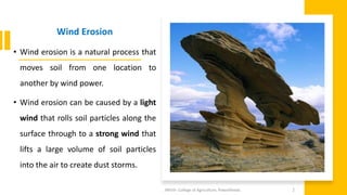 The document discusses wind erosion as a natural process that moves soil due to wind, primarily affecting arid regions, causing significant land and vegetation damage, reduced productivity, and health issues from airborne dust. It outlines factors influencing wind erosion, mechanics of soil particle movement, and various control measures, including proper land management, vegetation cover, and mechanical barriers. Effective strategies for reducing wind erosion involve maintaining soil moisture, utilizing crop residues, and implementing tillage practices.