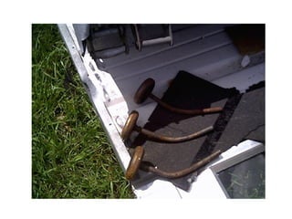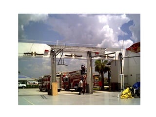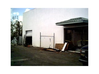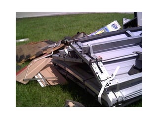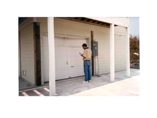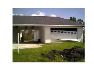 This document provides an overview of wind load technical information for garage doors. It discusses DASMA's role in providing technical guidance, and summarizes several technical documents covering topics like hurricane-resistant garage doors, connecting jambs to framing, and frequently asked questions. The bulk of the document is spent explaining DASMA's Wind Load Guides, covering concepts like design wind speed, exposure categories, and providing an example calculation of wind loads on a double garage door. Photos of garage door damage from high winds are also presented.