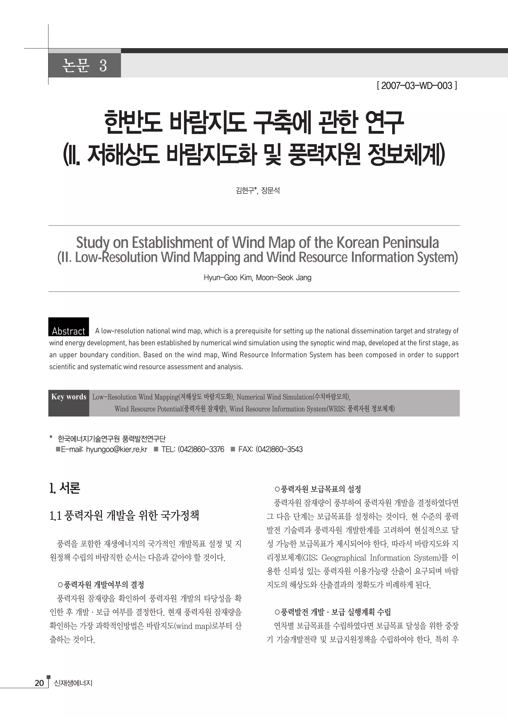 This document summarizes a study that established a low-resolution national wind map of the Korean Peninsula through numerical wind simulation using synoptic wind maps as an upper boundary condition. Based on this wind map, researchers composed a Wind Resource Information System to support scientific and systematic wind resource assessment and analysis. The study aimed to provide a prerequisite for setting national wind energy development targets and strategies by mapping wind resources across South Korea at a low resolution.