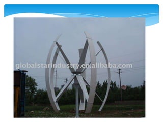 The document summarizes information about wind power and wind turbines. It discusses how wind turbines convert kinetic energy from wind into mechanical or electrical energy. Large wind turbines generate electricity in wind farms, while smaller turbines provide power for homes, farms, and businesses. The key components of a wind turbine include the rotor, gearbox, enclosure, and tail vane. Proper maintenance such as annual inspections and repairs is important to ensure wind turbines operate safely and efficiently for 20-30 years.