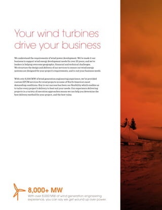 The document discusses a company that provides engineering and project management services for wind power projects. They have over 20 years of experience in wind energy development and have worked on over 8,000 MW of wind generation projects. They offer a range of services from initial feasibility studies through construction and commissioning. They aim to tailor their services to meet each client's specific needs.