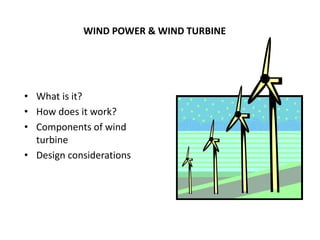 Wind power works by using wind turbines to harness the kinetic energy of the wind. Wind turbines capture wind energy through their rotor blades and convert it into mechanical rotation to spin a generator that produces electricity. Key components of a wind turbine include the blades, shaft, gearbox, generator, and tower. As wind speed increases, power output also increases up to the turbine's rated capacity, after which the turbine's design limits further power production. Larger turbines with taller towers and wider rotors can generate more electricity. Advantages of wind power are that it is a renewable domestic source of energy generation with no pollution.
