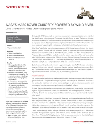 Wind River's VxWorks real-time operating system plays a central role in NASA's Mars rover Curiosity mission by controlling the rover's functions from launch to completion of its mission. VxWorks manages critical operations like navigation, descent, landing, collecting science data, and transmitting data back to Earth. It helped enable the complex and risky landing sequence within a small target zone on Mars. VxWorks has supported over 20 NASA missions due to its reliable and resilient nature which is essential for missions with no room for failure.