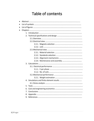 The document describes the design of an axial flux permanent magnet generator. It includes specifications for electrical and mechanical components. Key points: