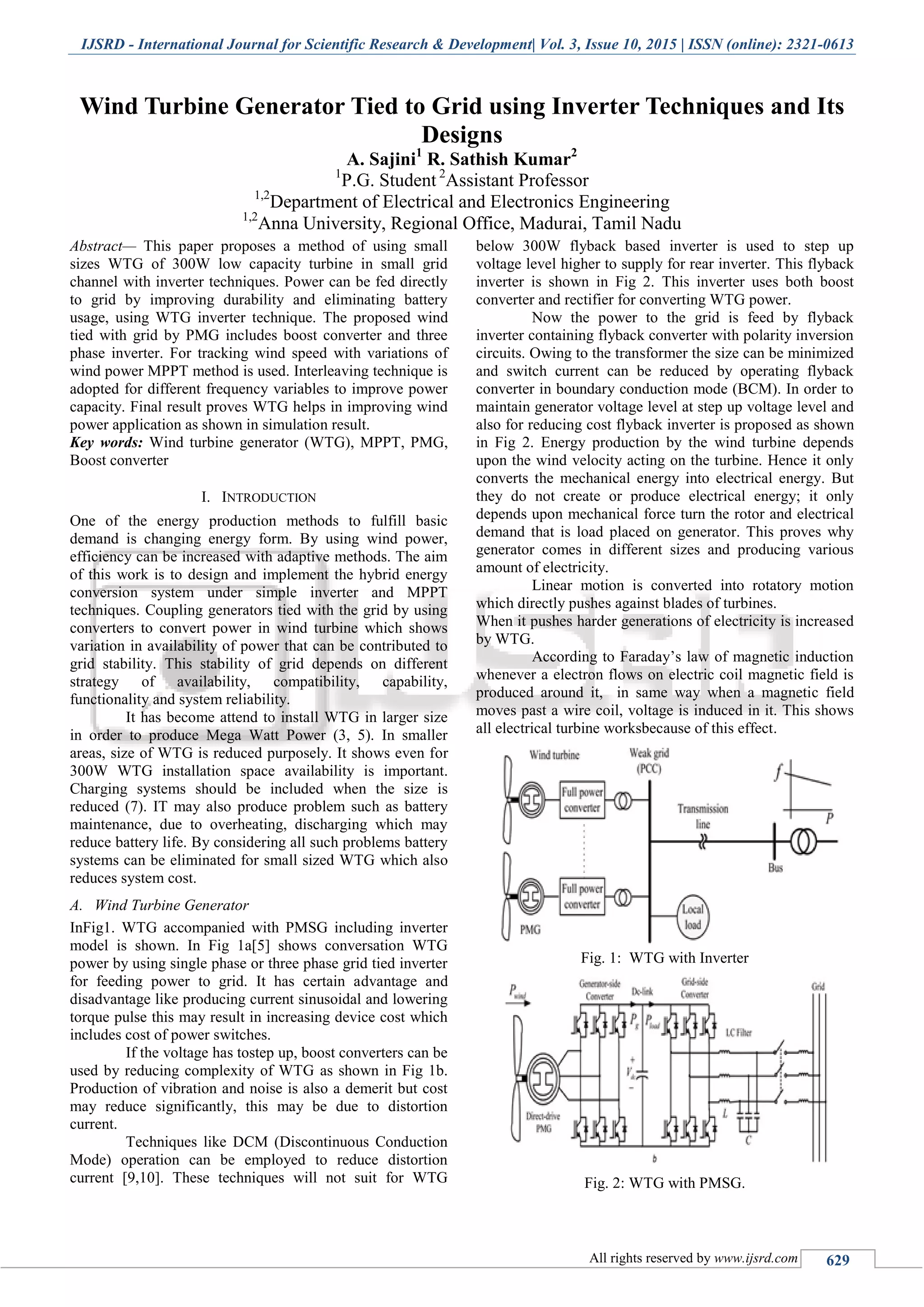 The document proposes a method for connecting small 300W wind turbine generators directly to the grid using inverter techniques, without the need for batteries. It describes using a permanent magnet generator coupled with a boost converter and three-phase inverter to stabilize voltage and maximize power extraction using MPPT control. Simulation results show that the proposed system is able to maintain grid voltage and power local loads by controlling active and reactive power flow.