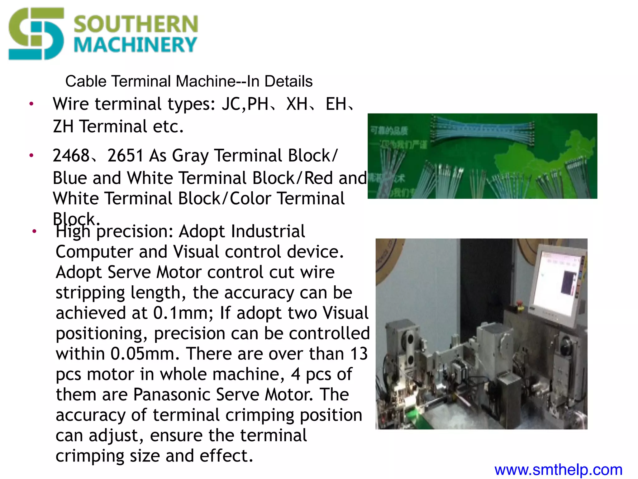 This document summarizes the details of a cable terminal machine. The machine can crimp various terminal types with high precision of 0.05mm using servo motors and visual controls. It has a crimping speed of 20,000 pieces per hour and can operate continuously for 24 hours. The machine also has features like full automation, low operation costs, foolproof functions, and a 10 year lifespan for main parts.