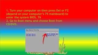 As a technician, you must understand how to install operating systems that are compatible with computer hardware. The document outlines the 20 step process for installing Windows 7 on a personal computer, including entering the BIOS, booting from the installation disc, selecting language and time preferences, accepting license terms, selecting partitions for installation, copying and expanding files, setting up user accounts and passwords, and configuring network and Windows update settings.