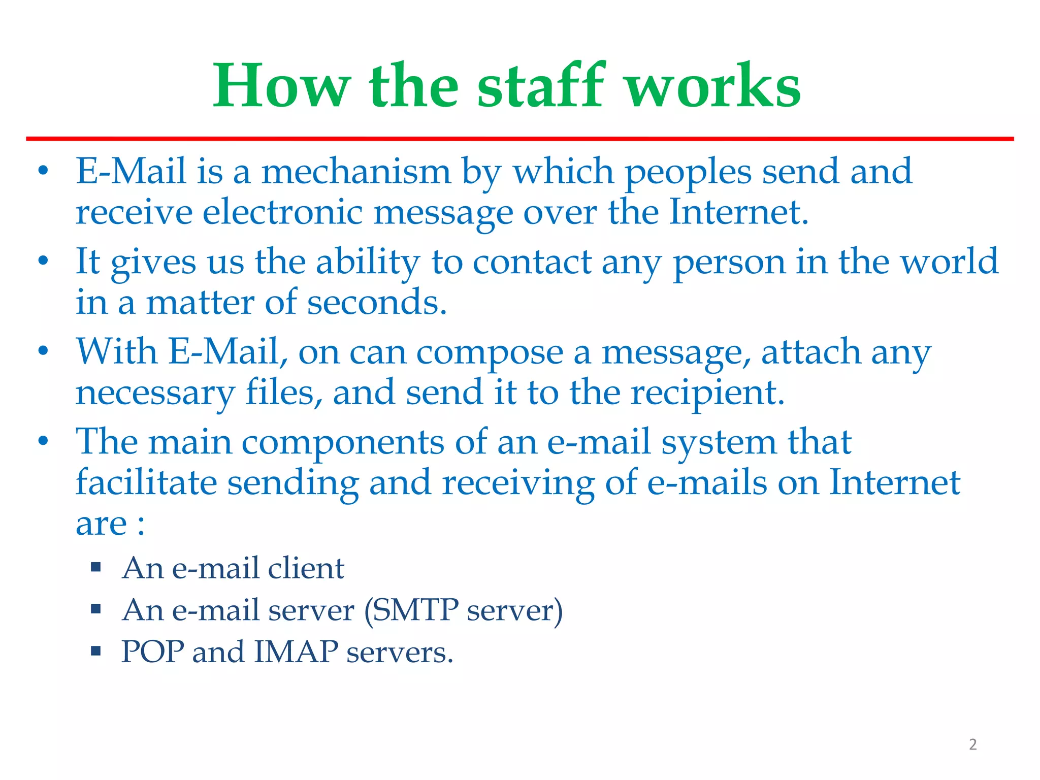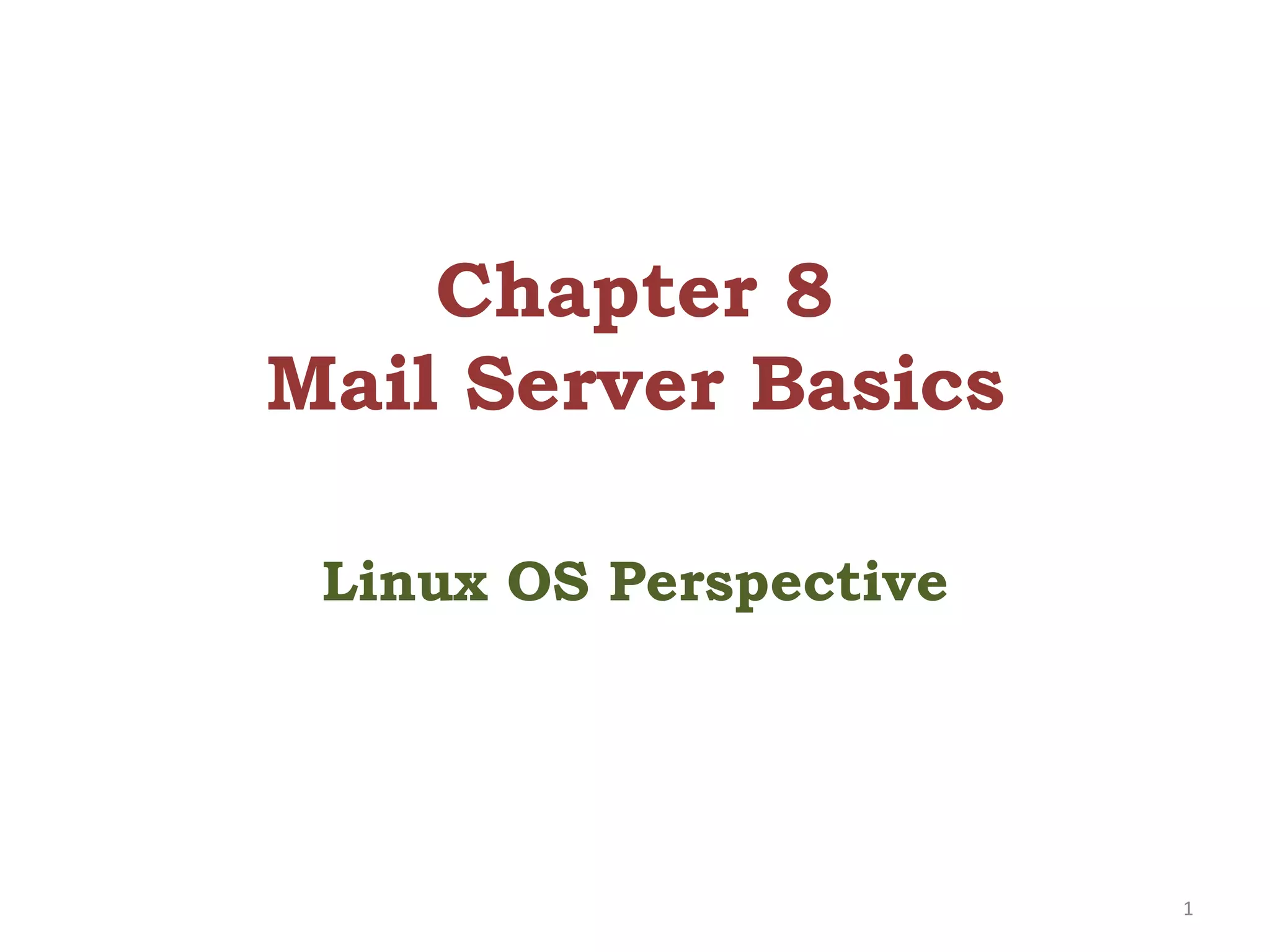 This document provides an overview of mail server basics from a Linux OS perspective. It discusses the main components of an email system including email clients, email servers, and POP and IMAP servers. It describes how email is sent and received, including the roles of SMTP, POP, and IMAP protocols. It also covers email administration tasks in Linux like configuring the hostname, timezone and hosts file. Remote administration tools like Webmin and secure remote access with SSH are also summarized.