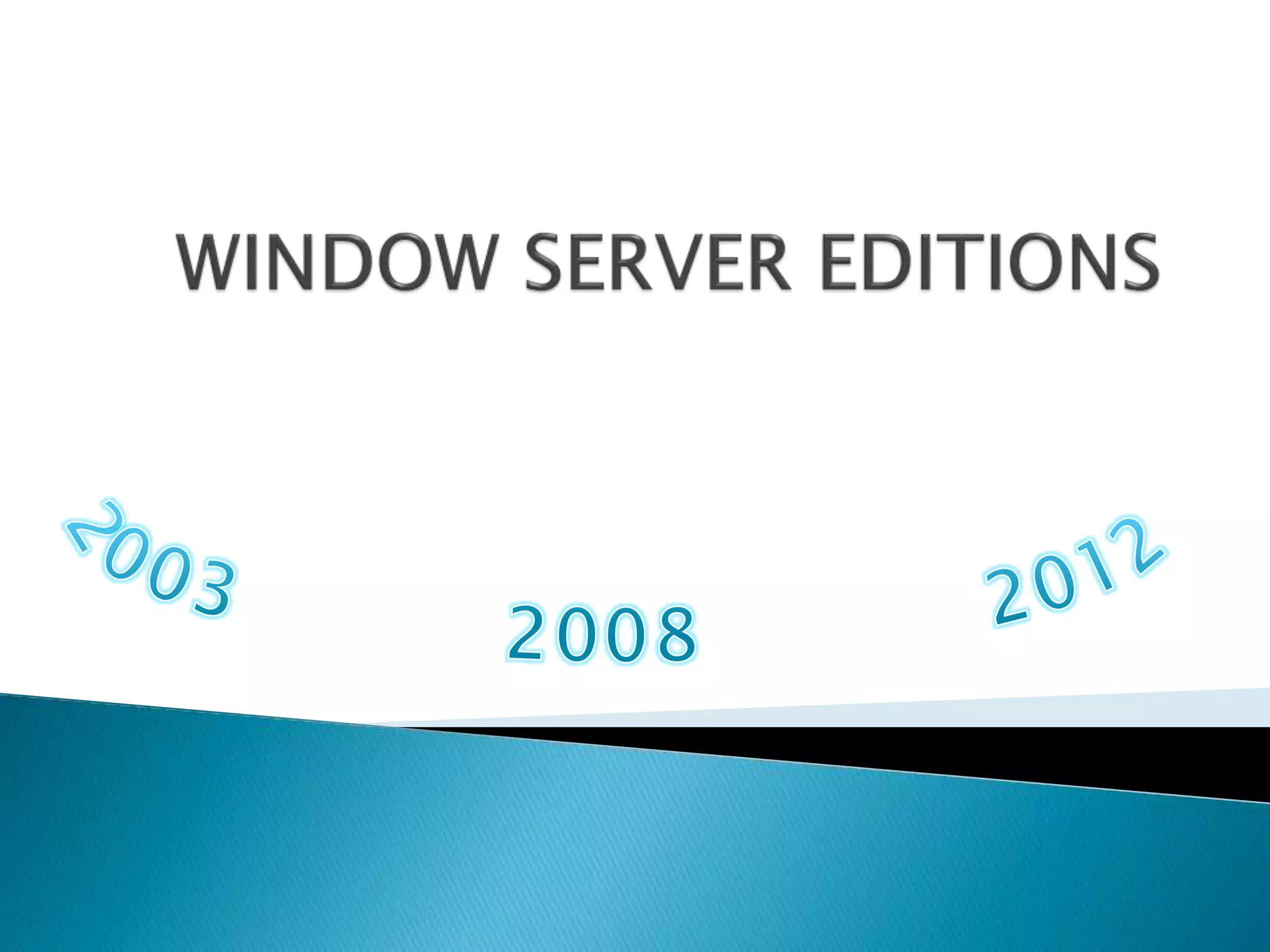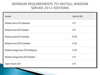 The document describes the different editions of Windows Server 2003, 2008, and 2012. It provides details on the features, functions, minimum requirements, advantages, and disadvantages of each edition. The editions range from Small Business Server and Web Edition for small organizations to Datacenter Edition designed for large enterprises with support for up to 512GB RAM and 64 processors. Key functions include Active Directory, security, virtualization, and management capabilities. Requirements vary by edition but generally include at least 1GB of RAM and 10GB of disk space.