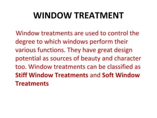 This document provides information on different types of window treatments. It classifies window treatments into two categories: stiff window treatments which include blinds, shades, shutters and screens, and soft window treatments such as curtains, drapery, valances and swags. Within each category, it describes various sub-types and provides details about their construction, materials used and functionality. It also discusses hardware items used for hanging window treatments like curtain rods, pelmets and cornices.