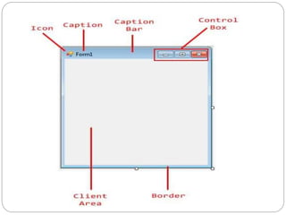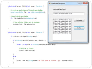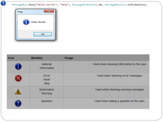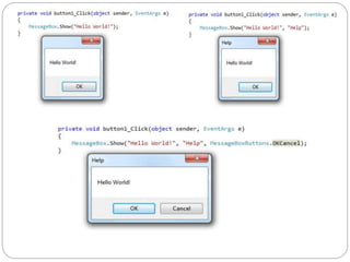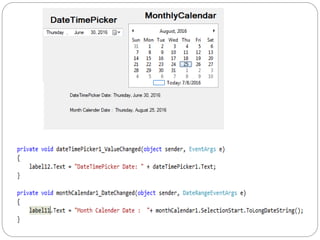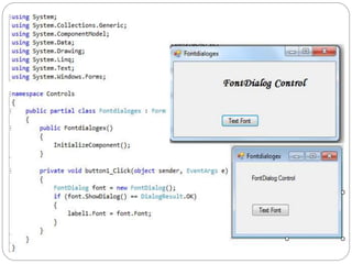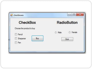 The document discusses various window controls in C# .NET including message boxes, forms, buttons, labels, text boxes, check boxes, radio buttons, date/time pickers, progress bars, and dialog boxes. It provides details on how to use each control, its purpose, and relevant properties.