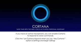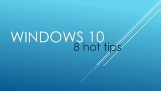 This document provides 8 tips for using new and improved features in Windows 10. It describes how to use the voice-activated Cortana personal assistant, take advantage of new keyboard shortcuts for window and task management, customize the Start menu, toggle between tablet and desktop modes, annotate web pages in Microsoft Edge, move apps between virtual desktops, unlock additional features in the Command Prompt, and maximize screen space using Snap Assist. The tips are intended to help users learn and make the most of new Windows 10 capabilities.