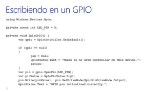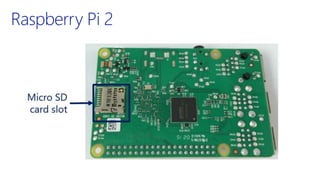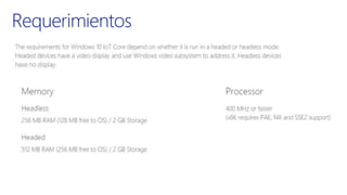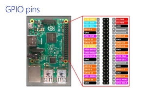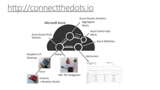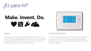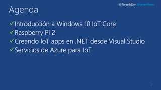 The document discusses the integration of Windows 10 IoT, Raspberry Pi, and Azure, presented by David Rodriguez, a Microsoft Azure MVP. It includes various links for resources, tutorials, and examples related to IoT development. The content is aimed at developers interested in leveraging these technologies for Internet of Things applications.