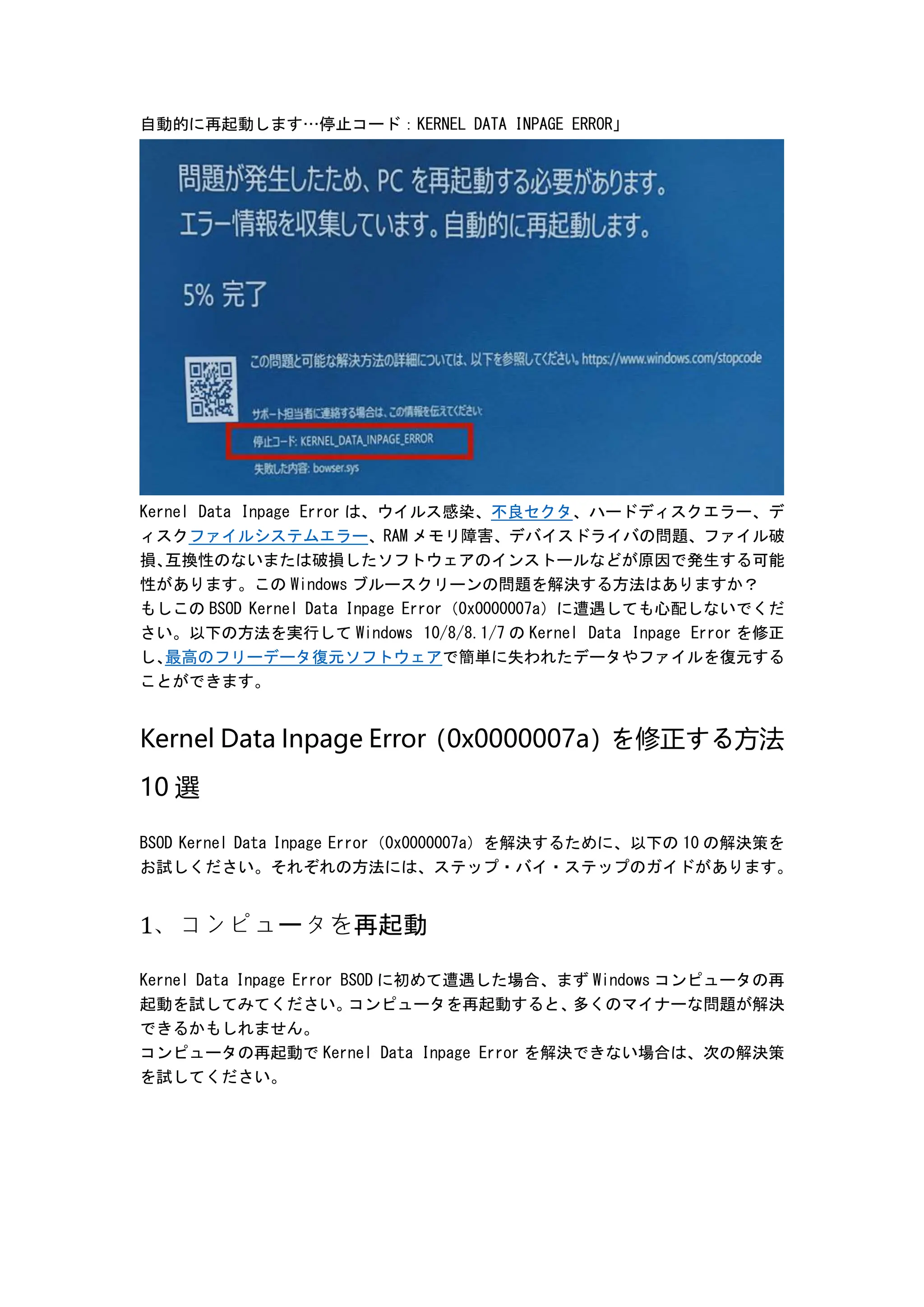 自動的に再起動します…停止コード:KERNEL DATA INPAGEERROR」
