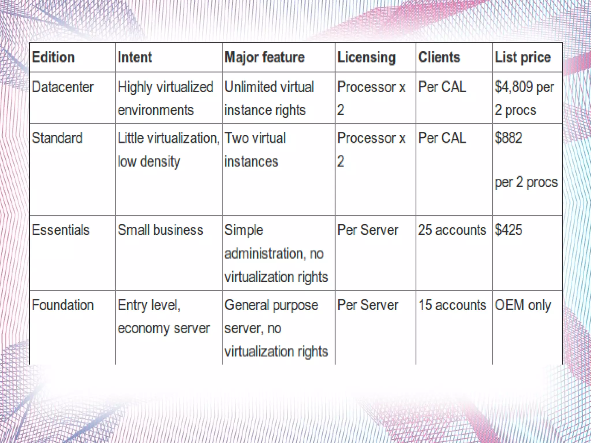 There are four editions of Windows Server 2012: Foundation, Essentials, Standard, and Datacenter. Foundation is for small businesses with up to 15 users and lacks advanced features. Essentials is also for small businesses but supports up to 25 users and features like Hyper-V. Standard is for small and medium businesses with no user limits and two virtual machines. Datacenter has no user or virtual machine limits and is for extensive virtualization. Licensing is based on servers for Foundation/Essentials and processors for Standard/Datacenter, which also require Client Access Licenses per user.
