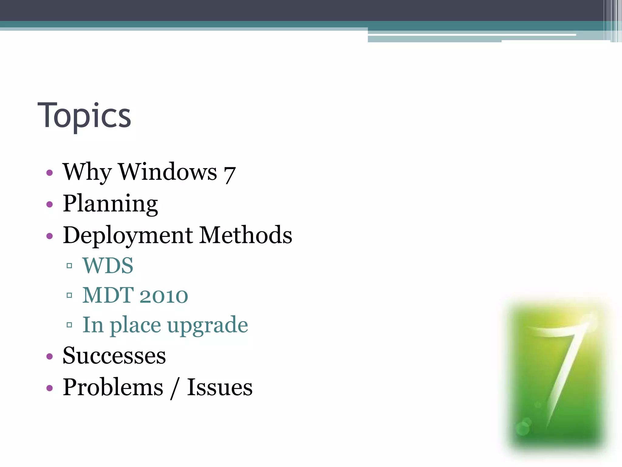 Windows 7 was deployed at West Hatch High School using Windows Deployment Services and Microsoft Deployment Toolkit 2010 to upgrade aging hardware and move from Windows XP. The deployment was a success, allowing older PCs to run Windows 7, though some drivers and issues with hibernation on laptops presented problems. The new deployment methods provided quick, easy, and customizable imaging to standardize the Windows 7 installation across different machines.