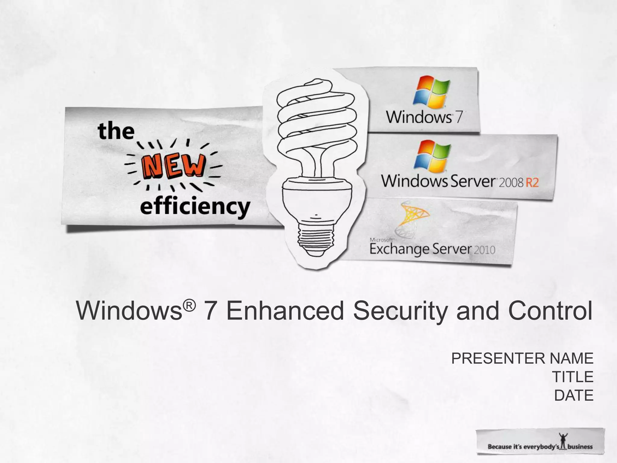 The document discusses Windows 7 security features such as User Account Control (UAC), AppLocker, Internet Explorer 8, BitLocker, and BitLocker To Go. It aims to manage risks through enhanced security and control, reduce costs by streamlining PC management, and make people productive anywhere. Key features include enforcing compliance, protecting desktop and mobile resources through encryption, and enabling more secure web browsing.