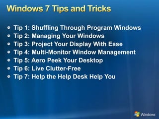 This document provides 35 tips for using Windows 7. It summarizes key features like shuffling through program windows, managing window sizes, projecting displays easily, using multiple monitors, peeking at the desktop, keeping the desktop clutter-free, and helping the help desk by recording steps to reproduce a problem. Many tips are accompanied by short instructions for taking advantage of Windows 7 features.