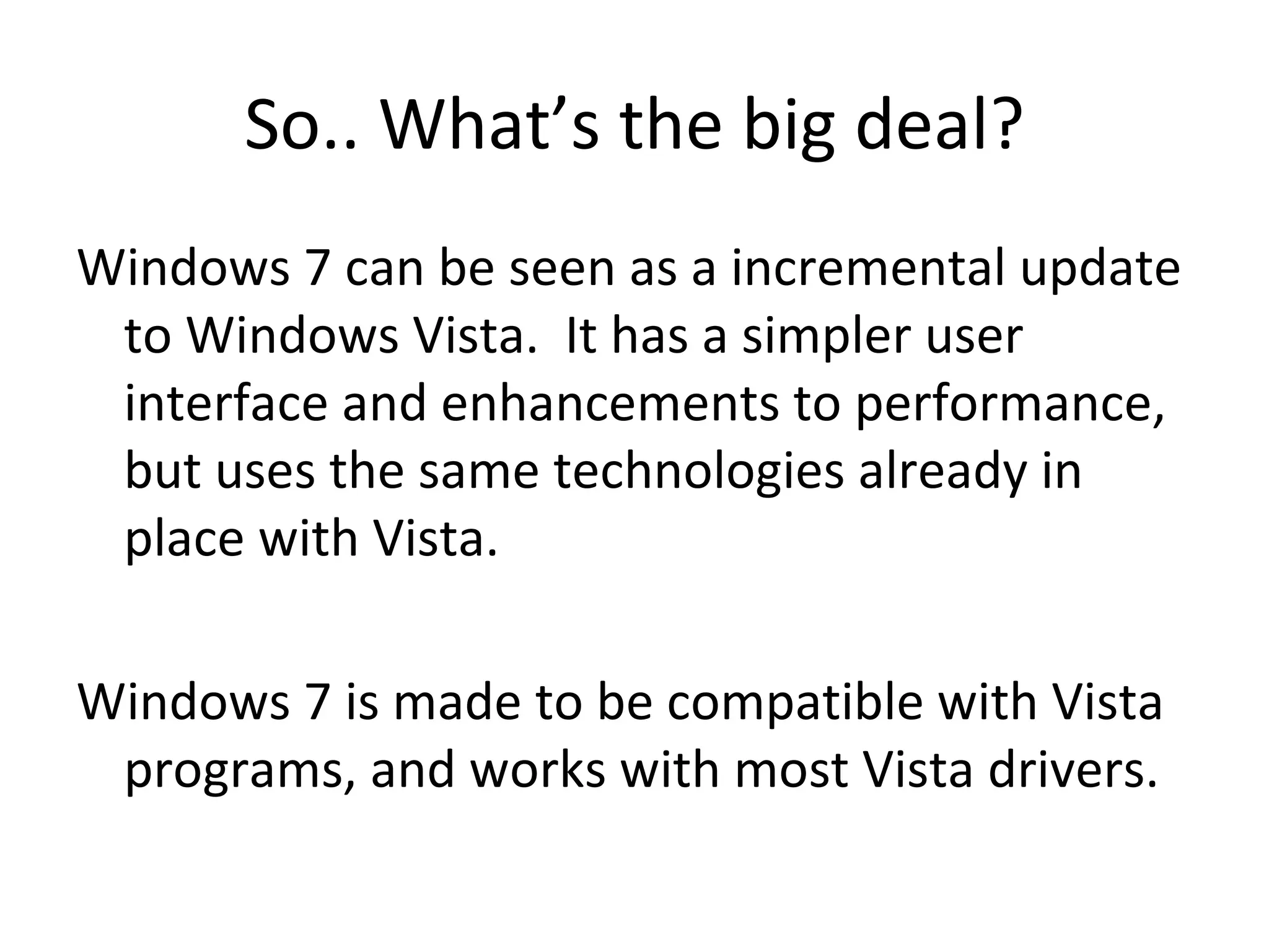 Windows 7 is an incremental update to Windows Vista that features a simpler user interface and performance enhancements while maintaining compatibility. It introduces new features like Jump Lists for contextual menus in the Start menu and taskbar, thumbnail previews of open windows in the taskbar, HomeGroups for easy file sharing between Windows 7 PCs, the Action Center for security and problem reports, and the Problem Steps Recorder for troubleshooting issues. Windows 7 Ultimate also includes XP Mode for running Windows XP virtually. Some default programs like Movie Maker and Messenger were removed but updated versions can be downloaded separately.