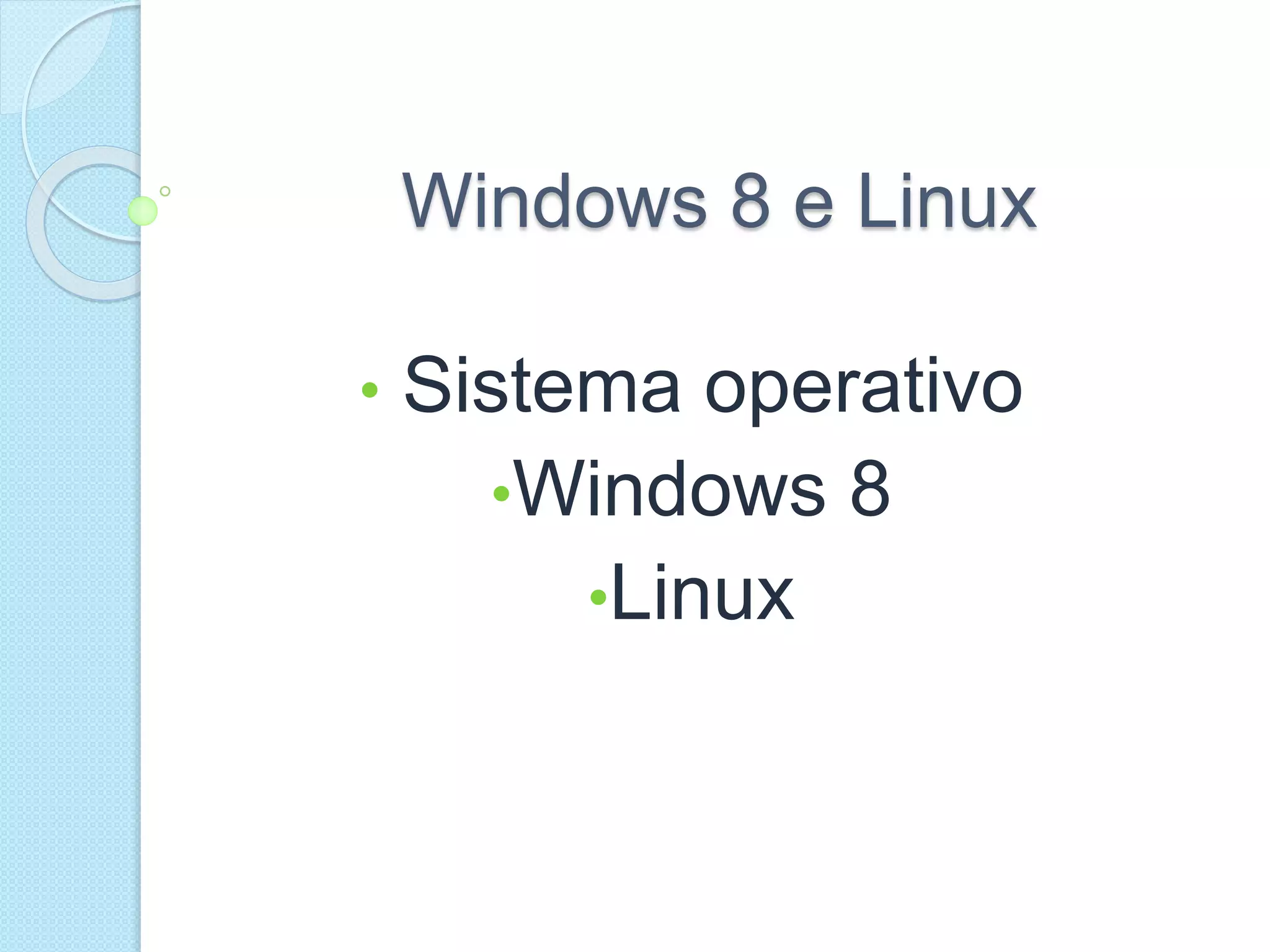 Il documento discute i sistemi operativi Windows 8 e Linux, evidenziando l'evoluzione di Windows dalla sua creazione nel 1985 fino alla popolarità di Windows 8, caratterizzato da un'interfaccia user-friendly e l'uso delle tiles. Descrive inoltre Linux come un sistema operativo inizialmente a linea di comando, con un'interfaccia grafica sviluppata nel 1998, sottolineando la sua natura open source e gratuita.