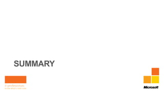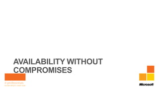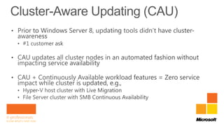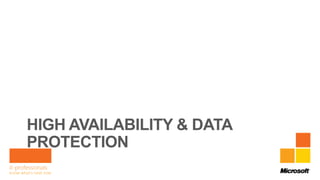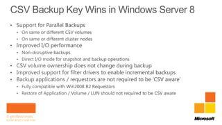 The document discusses new capabilities in Windows Server 8 for virtual machine mobility and disaster recovery. Key points include allowing unlimited live migration between hosts with no storage or cluster limits, supporting live migration with any storage solution including iSCSI, Fibre Channel, SAS or SMB, and enabling live storage migration between hosts. It also outlines approaches for application failover, I/O redundancy, node redundancy, and handling hardware faults.