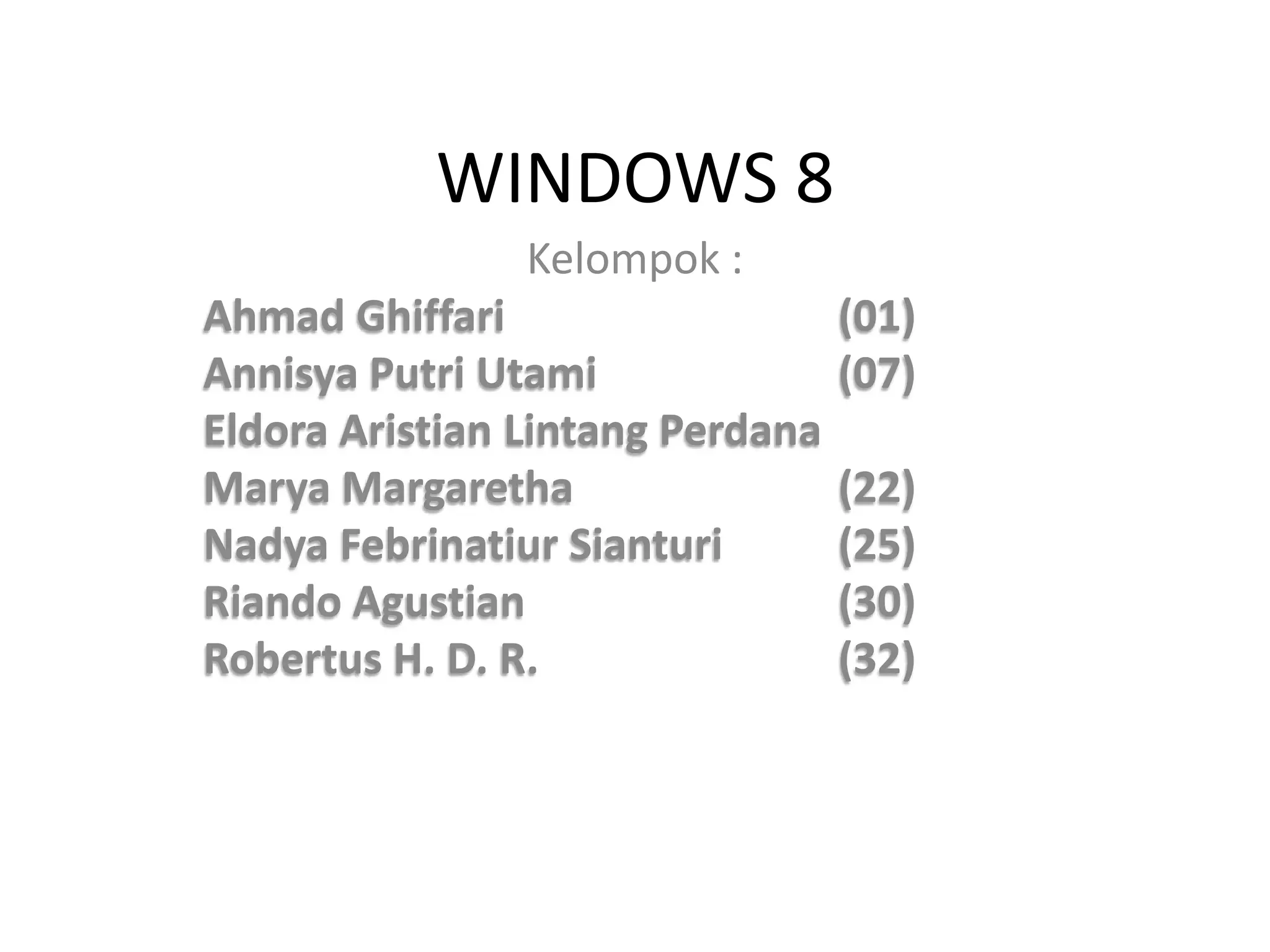 Windows 8 merupakan sistem operasi Microsoft yang dirilis pada 2012 dengan antarmuka pengguna yang diubah agar dapat digunakan pada perangkat layar sentuh selain mouse dan keyboard, sehingga didesain untuk perangkat tablet. Windows 8 memiliki kelebihan seperti tampilan yang lebih dinamis, sistem pencarian data yang lebih universal, dan waktu booting yang lebih cepat. Akan tetapi, Windows 8 juga memiliki kekurangan seperti tidak memiliki tombol start dan close serta