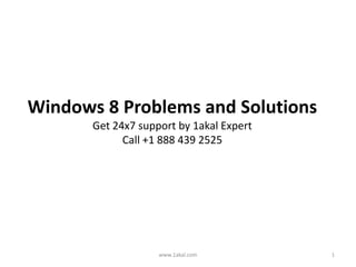 The document outlines common problems and solutions for the Windows 8 operating system, including issues with automatic restarts, freezing metro apps, and printer malfunctions. It provides step-by-step instructions for resolving these issues, such as disabling the fast startup feature and reinstalling printer drivers. For immediate support, the document suggests contacting 1akal expert support.