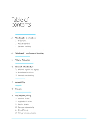 Windows 8.1 deployment planning guide for educational institutions. Key areas covered include IT benefits of familiar management tools, faculty benefits of compatibility with existing software and familiar Windows platform, and student benefits of access to vast library of Windows applications. The document provides guidance on purchase and licensing, volume activation options, network infrastructure requirements including internet access and bandwidth, and deployment methods for institution-owned and personal devices.