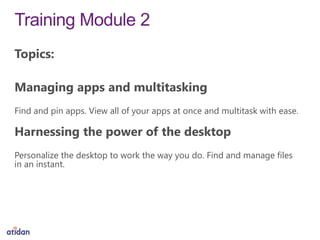 This document provides an overview of training topics for Windows 8.1, including managing apps and multitasking, and harnessing the power of the desktop. It discusses how to find and pin apps, list open apps, multitask with multiple apps, and close apps. It also covers using the desktop and Start screen, applying backgrounds, pinning folders, using File Explorer to manage files, enabling File History, and contact information for additional resources.