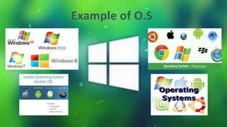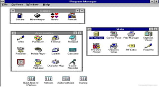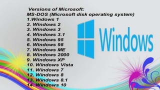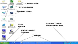 An operating system controls a computer and provides an interface between the user and hardware. Microsoft Windows is called Windows because it allows multiple windows for different tasks, unlike its predecessor MS-DOS which used a single-task command line. Windows uses windows, icons, and menus through which users can carry out commands like opening and deleting files, with a mouse or keyboard shortcuts. The main Windows components are the desktop, start button, taskbar and shortcuts. The control panel allows configuration of Windows appearance and functions.