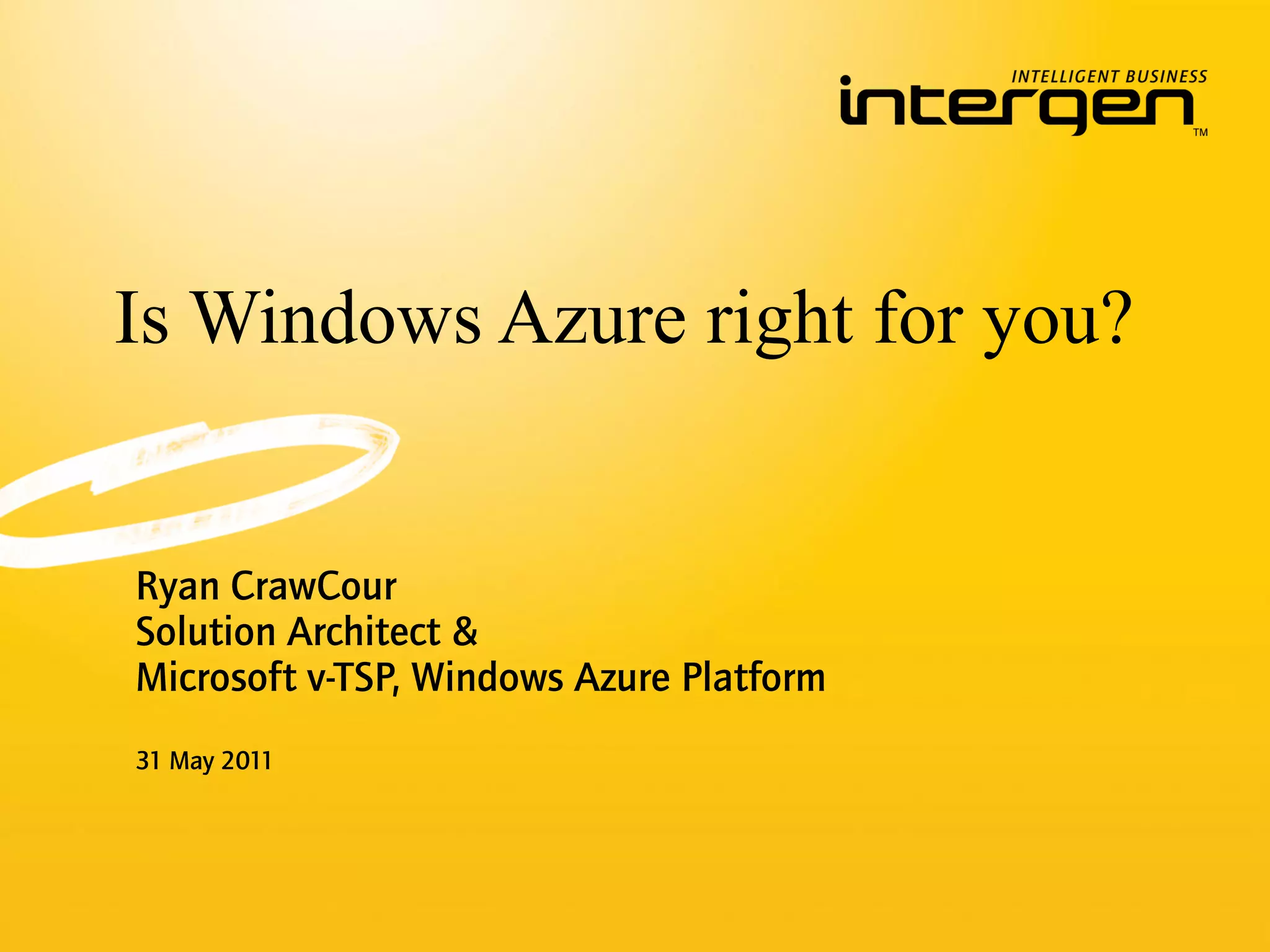 This document discusses whether Windows Azure is the right cloud platform. It covers why cloud computing is beneficial as a utility service model, why Microsoft is well-positioned in the cloud with its breadth of offerings across platforms, and what types of scenarios are well-suited for the Windows Azure platform, such as applications with changing loads or seasonal usage patterns. It also addresses some challenges with cloud like data security and outlines steps to evaluate and adopt cloud computing like identifying opportunities, calculating total cost of ownership, and conducting proof of concepts.