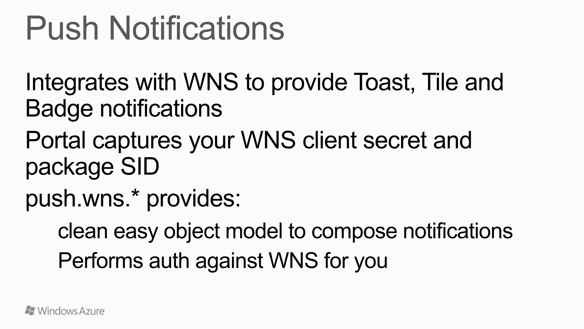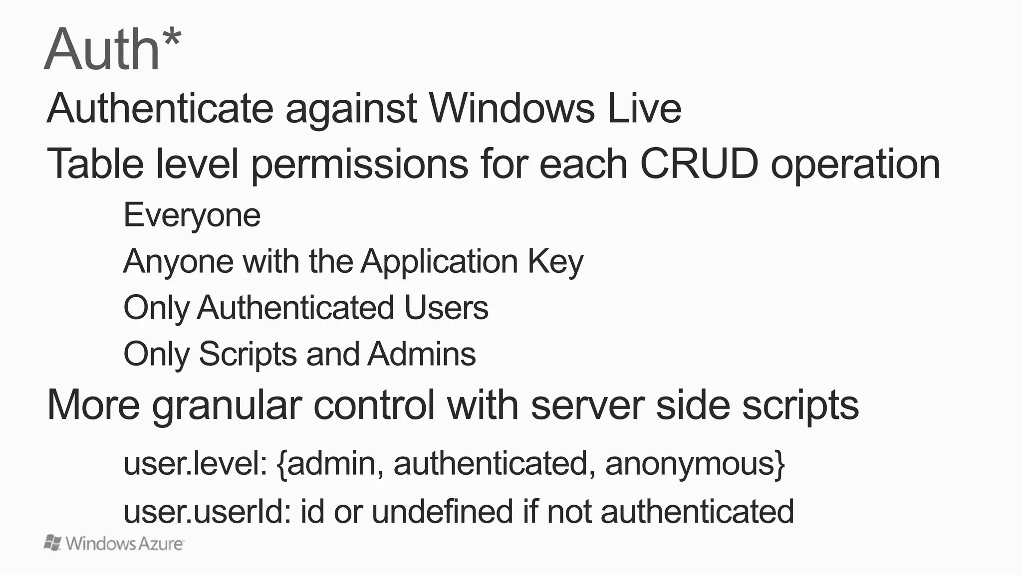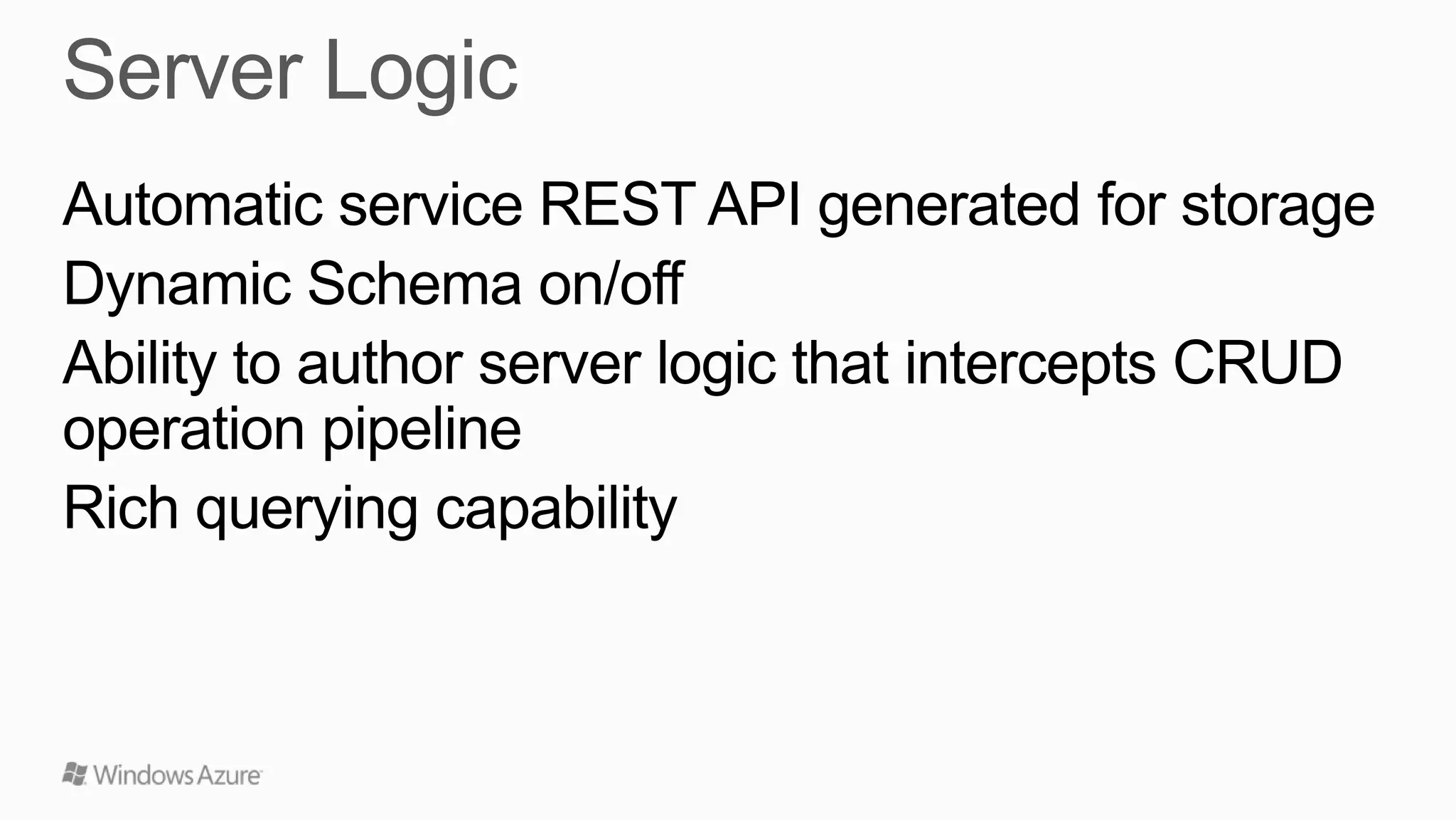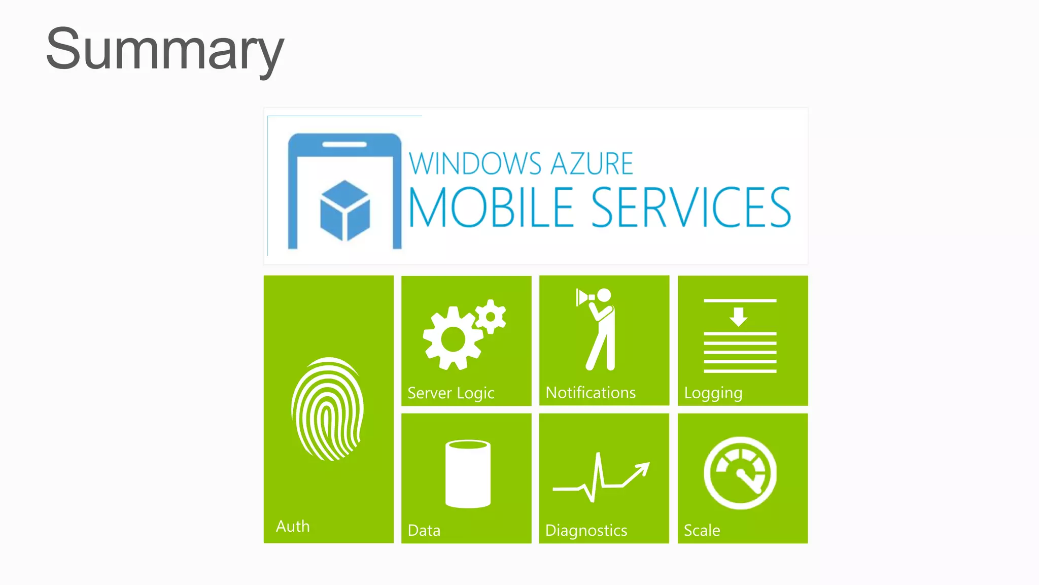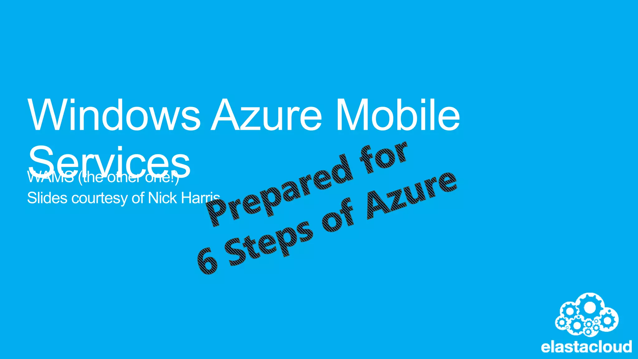 This document summarizes Windows Azure Mobile Services, which are ideal for supporting modules and globals like mssql, request, console, and tables. It notes that numeric, boolean, datetime, and string JSON values map to specific T-SQL types. Mobile Services provide logging, diagnostics, and scale for both compute and storage resources. The document also provides tutorials, API references, and contact information for additional questions.