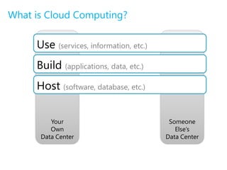 This document provides an overview of Microsoft Cloud Platform. It discusses what cloud computing is, the different service categories and cloud types. It then describes Microsoft's cloud strategy and history in cloud computing. The rest of the document details Microsoft's cloud infrastructure including their global data center network, server container deployment, and categories of cloud services like compute, storage, data and platform services. Pricing models for consumption, subscription and volume licensing are also mentioned.