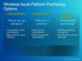 The document summarizes pricing and service level agreements for the Windows Azure Platform. It provides details on consumption, commitment, and volume licensing purchasing options. Pricing is listed for compute, storage, databases, and other services. Service level agreements guarantee a minimum level of uptime and connectivity. The document also outlines offers for development/testing and international availability.