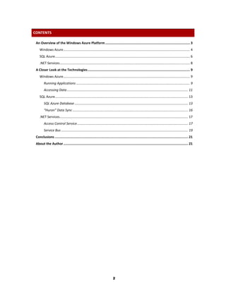 Windows Azure, SQL Azure, and .NET Services make up Microsoft's Windows Azure platform for building applications that use cloud computing. Windows Azure provides a cloud-based environment for running applications and storing data. SQL Azure offers data services like SQL Azure Database and data synchronization. .NET Services provides distributed infrastructure services for applications. These services help developers build applications that leverage the scale and flexibility of the cloud.