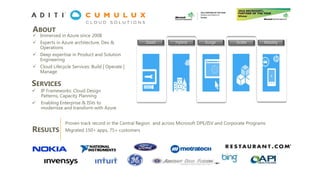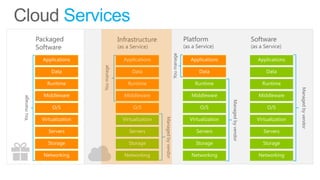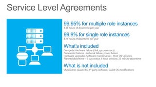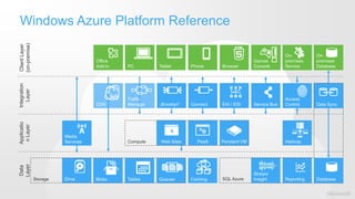 The document provides an overview of the Windows Azure Platform. It describes the client, integration, and application layers that make up the platform. It also outlines the data services available, including storage, databases, computing resources, and networking capabilities. Finally, it discusses high availability and deployment options for ensuring reliability and uptime of applications and services built on the Azure platform.
