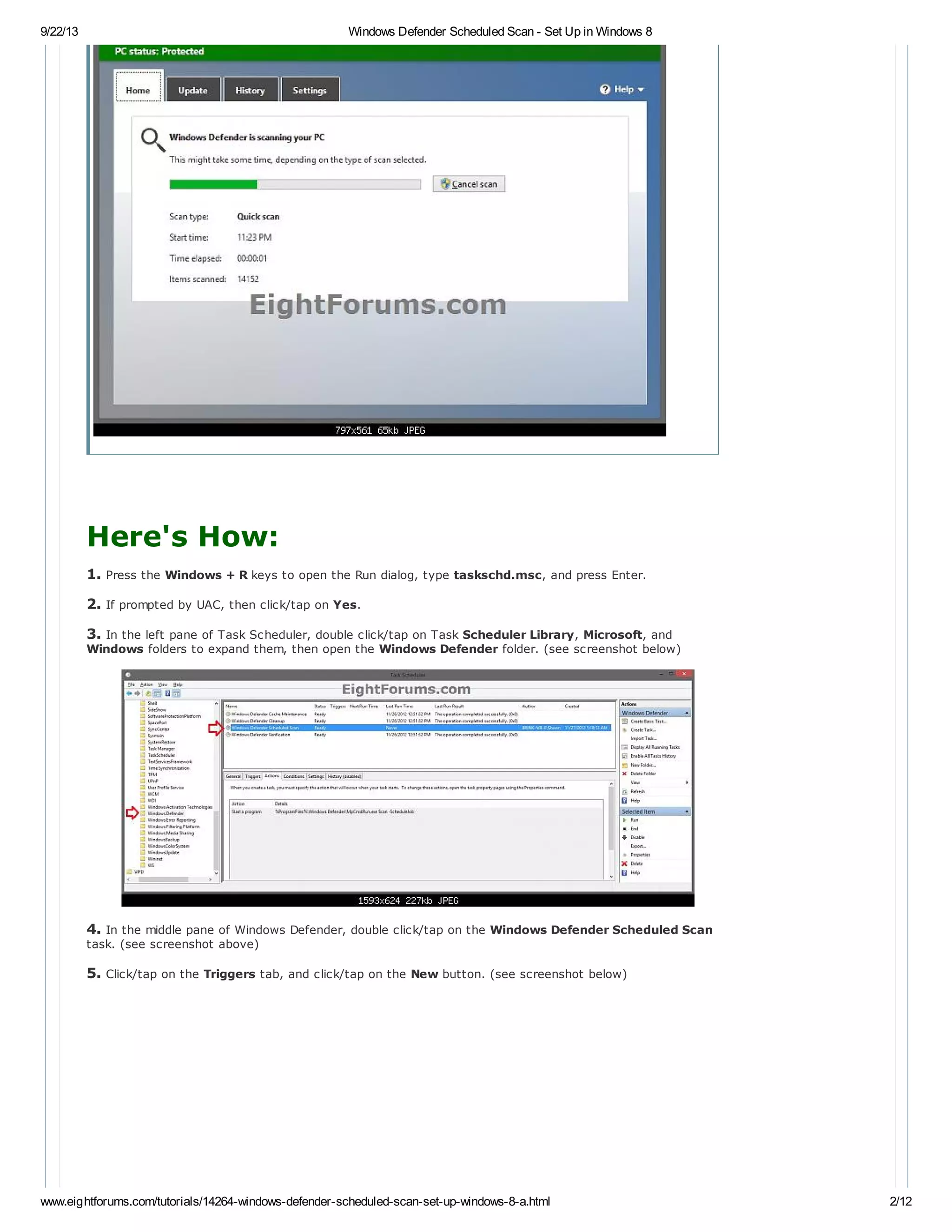 The document provides instructions for setting up scheduled scans in Windows Defender for Windows 8. It outlines 12 steps to configure the Windows Defender Scheduled Scan task through the Task Scheduler. These include selecting a schedule of daily, weekly or monthly, choosing between quick or full scans, and setting power options. Following these steps will allow Windows Defender to automatically scan the system on the scheduled interval for malware and other threats.