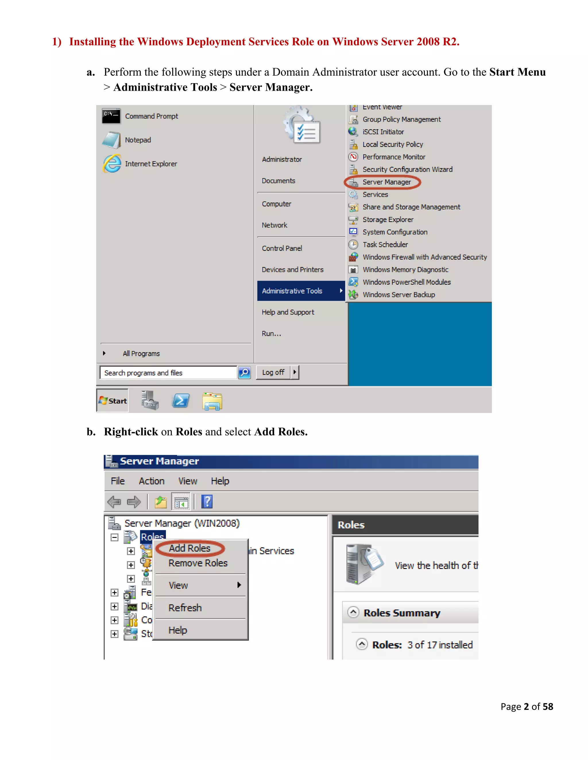This document is a comprehensive tutorial for installing and configuring Windows Deployment Services (WDS) on a Windows Server 2008 R2 system. It covers the minimum requirements, installation steps, configuration of server settings, and details for uploading drivers and creating boot and capture images. The tutorial includes step-by-step instructions for various processes involved in deploying Windows operating systems using WDS.