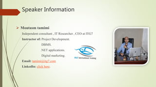 This document provides an overview and instructions for creating a Windows Form Application using C# and Microsoft Visual Studio. It discusses concepts related to Windows Forms and how to add items like forms, controls, properties and events. Code examples are provided for handling events, linking between forms, and accessing the code behind a form. The speaker information and a table of contents are also included.