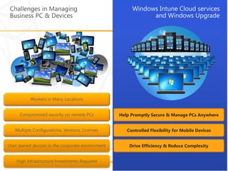 This webinar summarizes Windows Intune, a cloud-based PC management service from Microsoft. It allows administrators to securely manage updates, monitor PCs, provide remote assistance, and set security policies from a simple web-based console. Windows Intune helps protect PCs from malware, enables a mobile workforce, and drives savings through automated updates and low infrastructure overhead.
