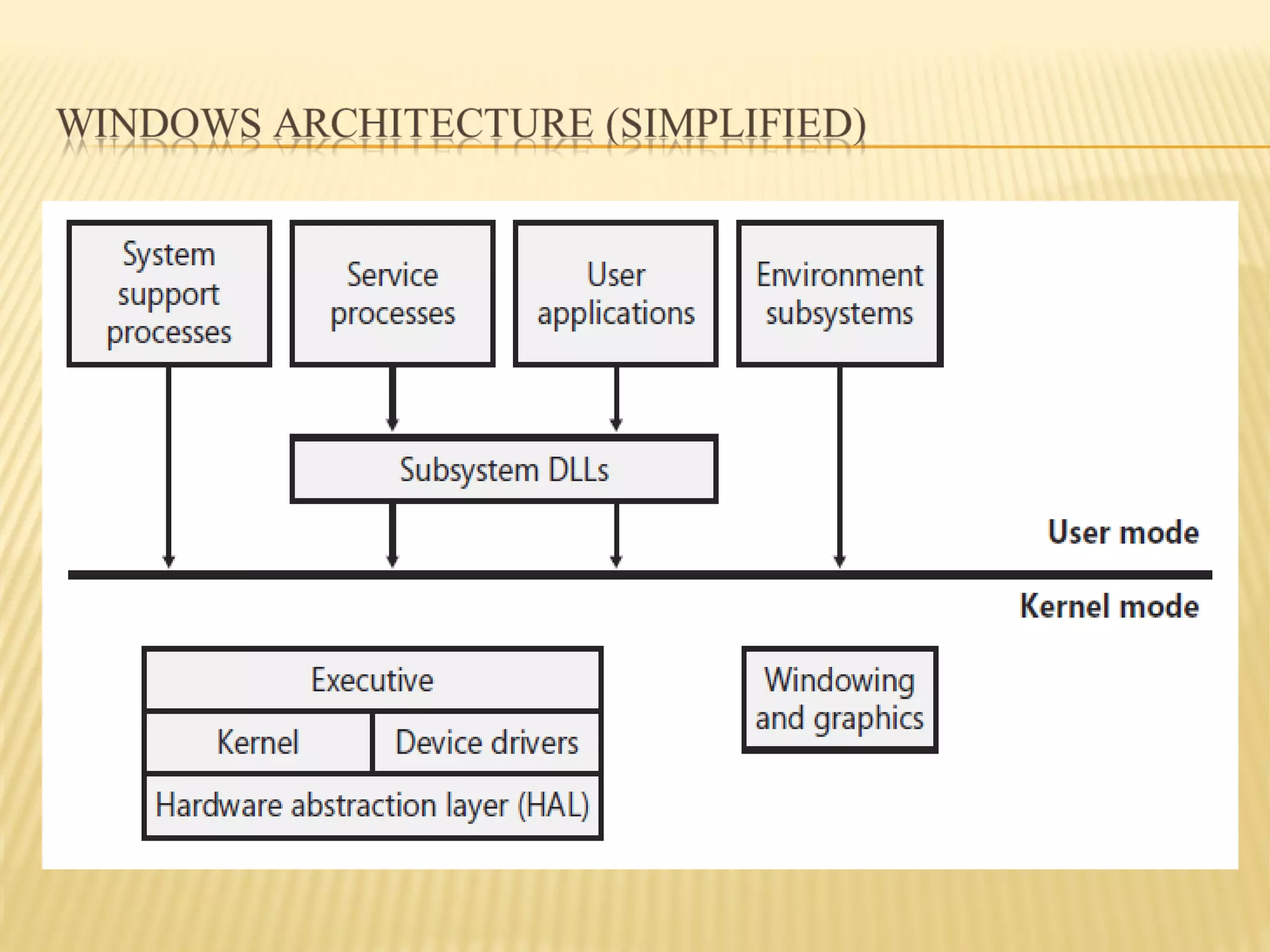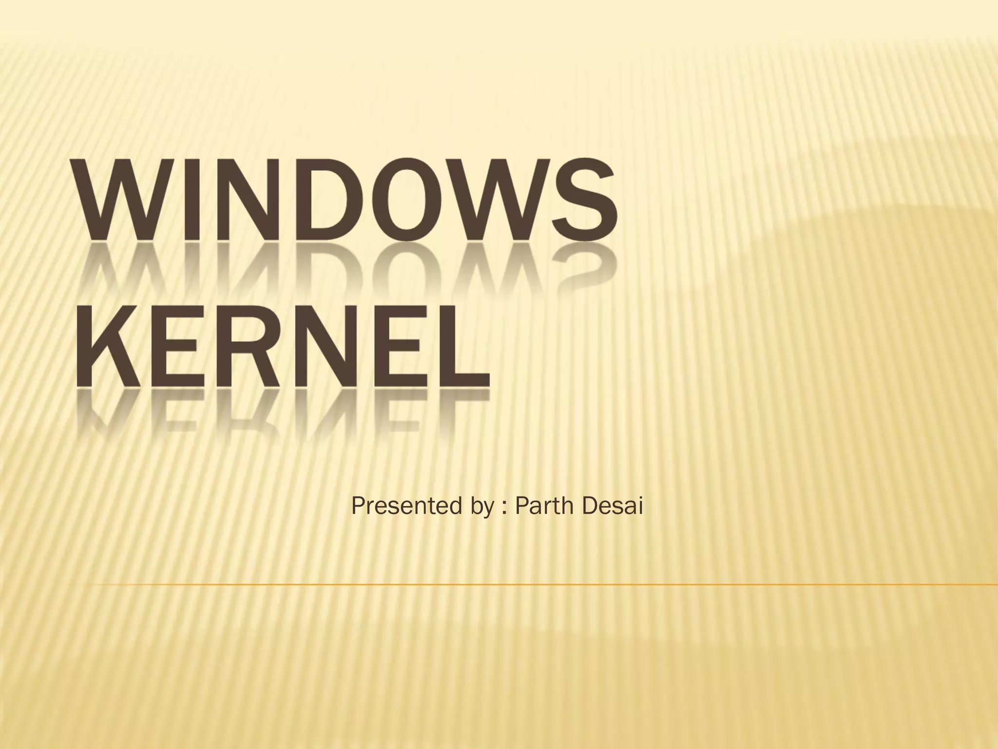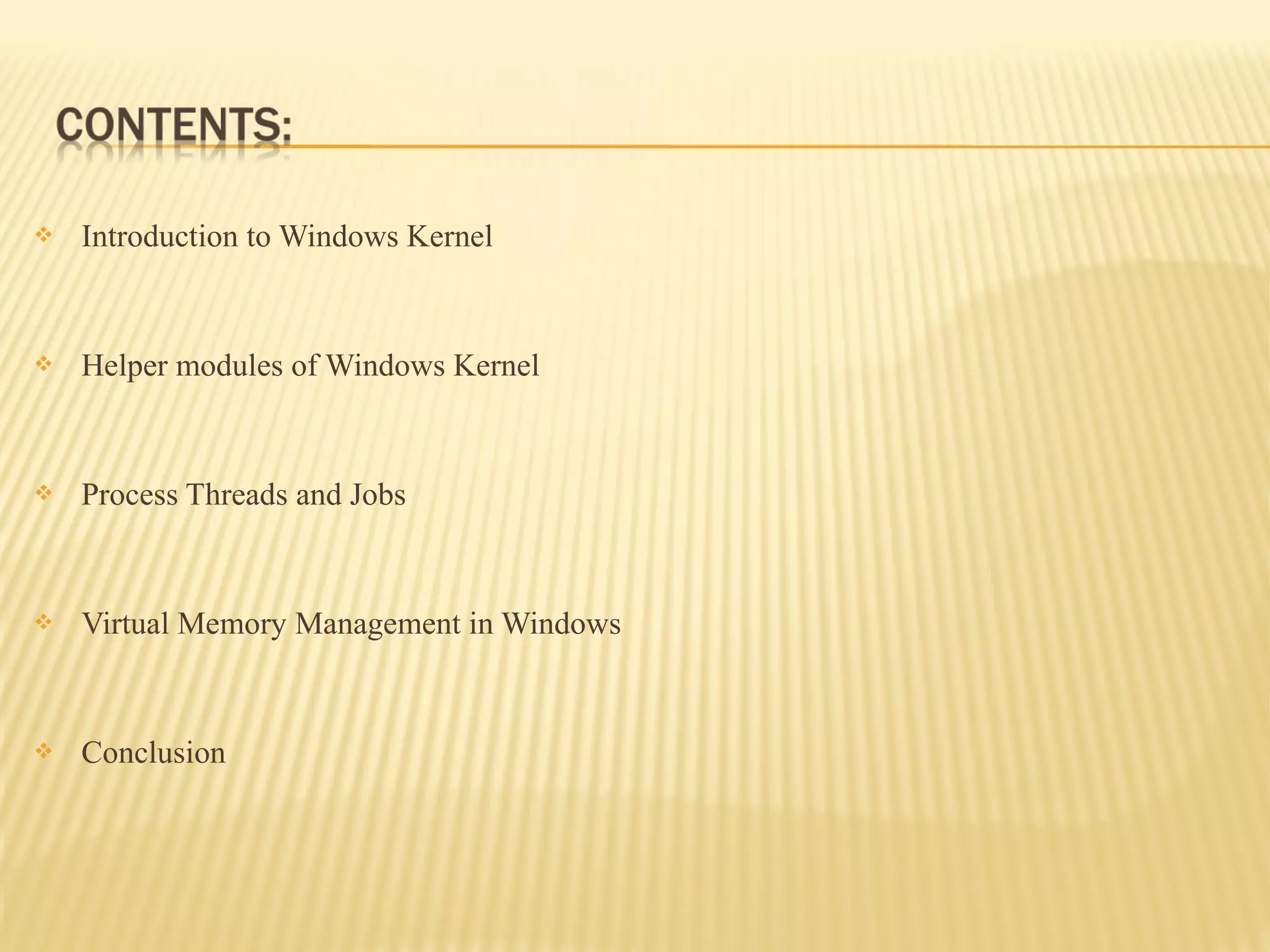 The document discusses key concepts related to the Windows kernel, including objects, processes, threads, virtual memory management, and helper modules. It explains that the kernel provides fundamental mechanisms and hardware support, while the executive layer manages objects like processes and threads and implements virtual memory. Processes act as containers for threads, which are the only schedulable objects, and the scheduler prioritizes and switches between threads based on their and their process' priority levels. The document also describes how each process has a private 4GB virtual address space, with the lower half for the process and upper half reserved for the kernel and drivers.