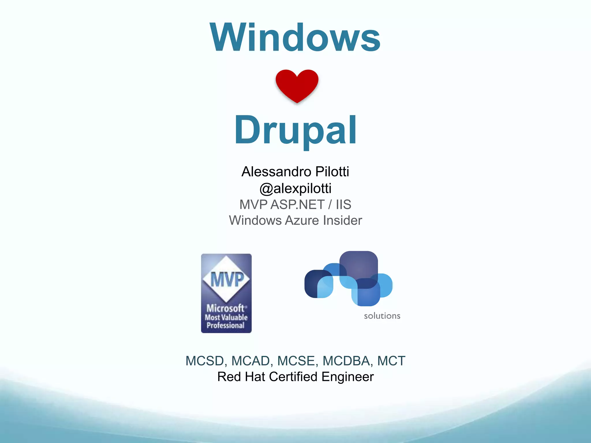 The document provides a comprehensive overview of Windows operating systems and IIS, detailing their architecture, performance improvements, and security features. It compares various PHP stacks on Windows and Linux, highlighting pros and cons, and discusses specific integration features for database management and Drupal deployment. Additionally, it covers tools like Web Platform Installer and Drush for simplifying setup and management of web applications on IIS.