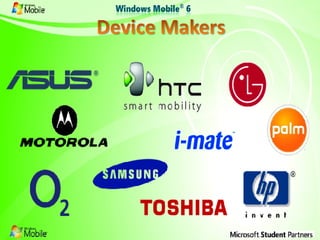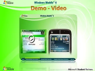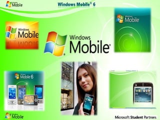 Windows Mobile 6 was released in 2007 and was based on Windows CE 5.2. It included improvements like support for higher screen resolutions of 800x480, the ability to open and edit Office documents directly on smartphones, and new features like operating system updates and VoIP calling. It also included enhancements like Smartfilter for faster searches, Internet sharing to use the device as a modem, and support for AJAX, JavaScript and searching Exchange server address books from mobile devices.