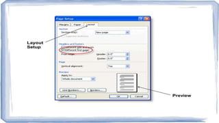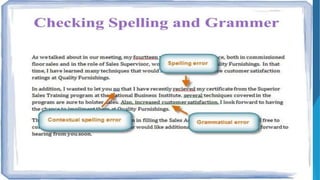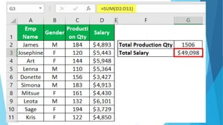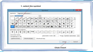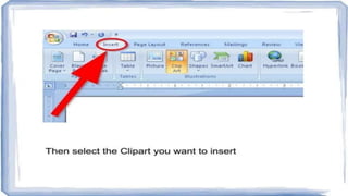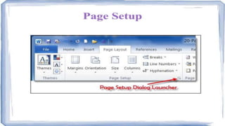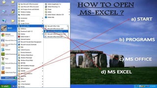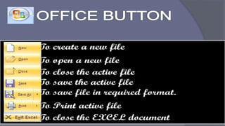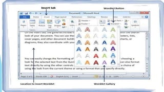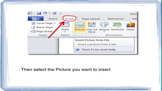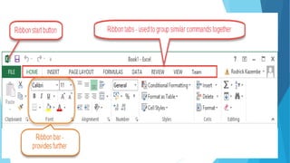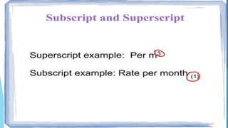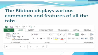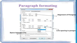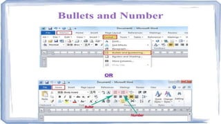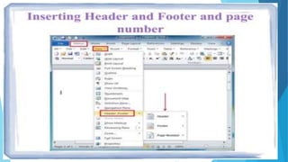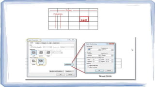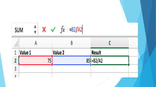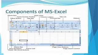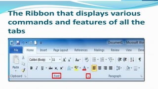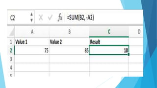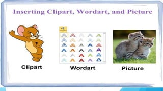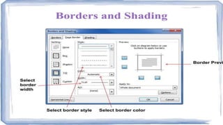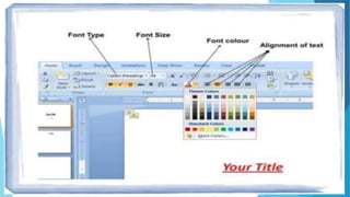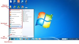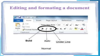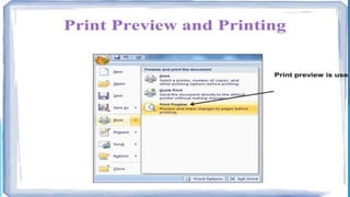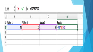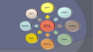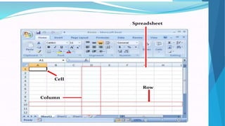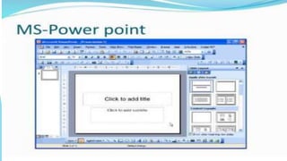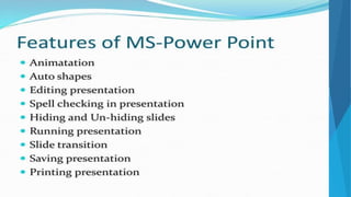 Microsoft Office includes applications such as Word for word processing, Excel for spreadsheets, and PowerPoint for presentations. Word allows users to type documents and includes features for formatting, adding graphics, and printing. Excel allows users to enter data into spreadsheets and perform calculations using formulas. PowerPoint enables users to create slideshows with text, images, animations, and other multimedia elements to present information to audiences.