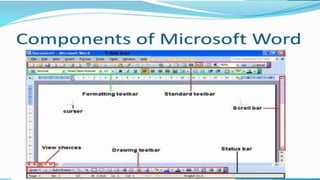 Microsoft Office includes applications such as Word for word processing, Excel for spreadsheets, and PowerPoint for presentations. Word allows users to create documents and includes features for formatting, adding graphics, and printing. Excel allows users to enter data into spreadsheets and perform calculations using formulas. PowerPoint enables the creation of slideshows with elements like text, images, animations, and transitions to present information to audiences. These applications are commonly used for office and business purposes like documentation, financial analysis, and presentations.