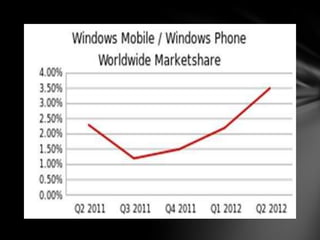 Windows Phone is Microsoft's mobile operating system that was launched in 2010. It uses a new "Modern Style" user interface and integrates with Microsoft and third party services. In 2011, Microsoft partnered with Nokia to make Windows Phone the primary smartphone OS for Nokia. Windows Phone 8, announced in 2012, will replace the previous Windows CE architecture with one based on the Windows NT kernel, allowing easier porting of apps between Windows Phone and Windows 8. New Windows Phone 8 devices include the Nokia Lumia 920 and 820, and the HTC Windows Phone 8X. These devices offer advanced cameras, displays, and features and are now available through AT&T.