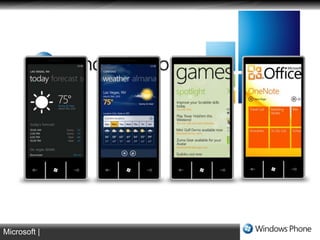 This document provides an overview of the Windows Phone 7 (WP7) architecture and platform. It discusses the goals of putting the end user first and building richer, deeper apps. It outlines the platform components, including the client runtime, frameworks, and cloud services. It describes the application model and how apps are developed, tested, packaged, certified and deployed to the Windows Phone Marketplace. It also covers the user interface model and how pages, sessions and navigation work. Key services like push notifications, location and Xbox Live integration are summarized.